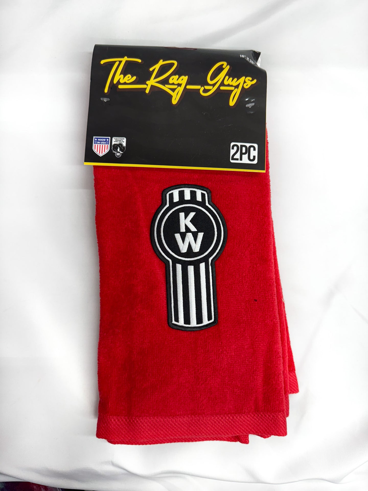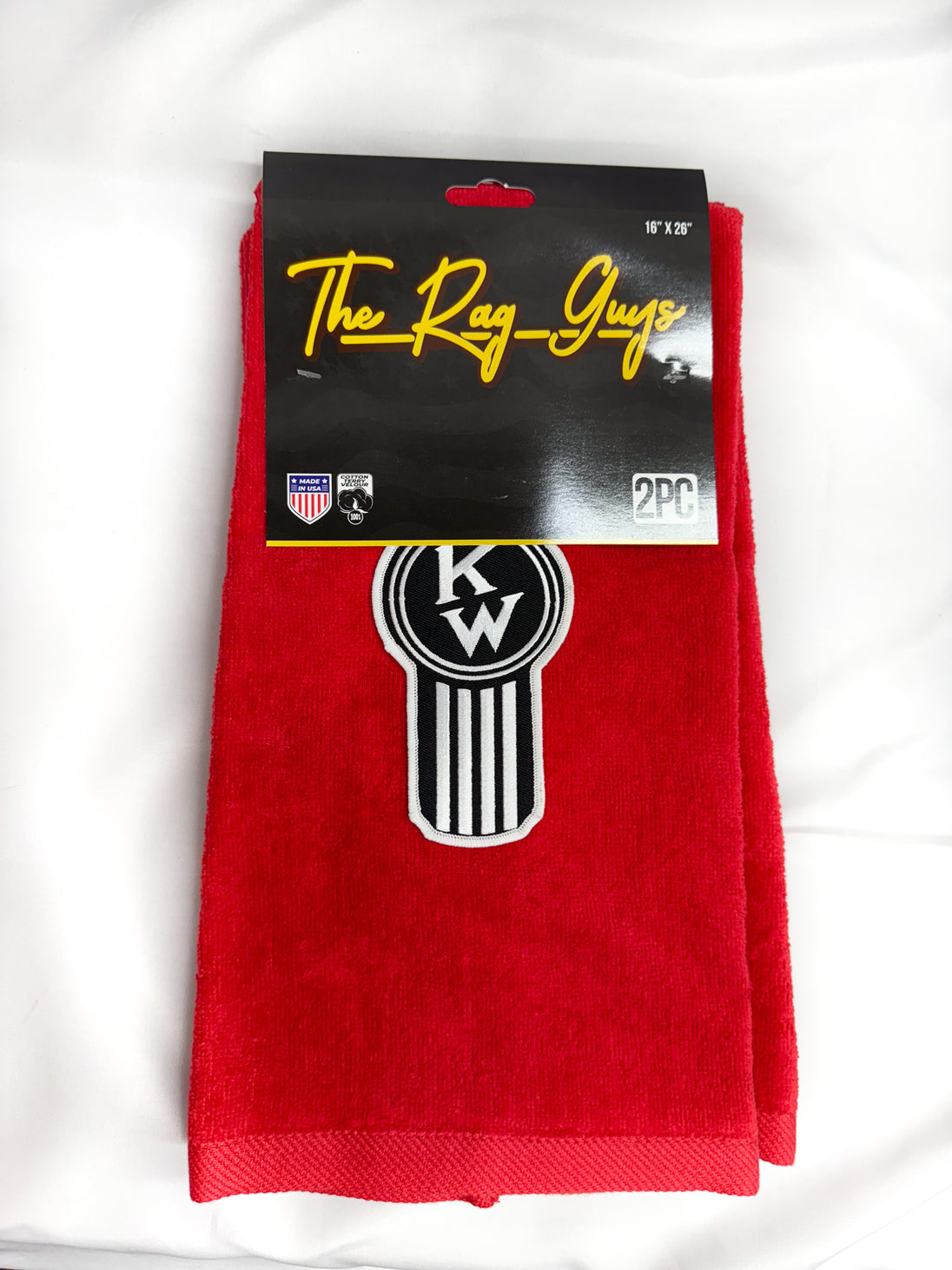 Kenworth Door Rags - Come in a set of two - Choose between emblems with normal font or with 'Fancy' script with the 'Crooked' Old style or Straight up & down - Comes in Tan, Black & Red