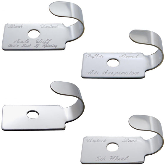 United Pacific - Peterbilt 300 Series 1989 Through 2000 Stainless Switch Guards - Available With The Following Scripts: Axle Differential, Fifth Wheel, Air Suspension Or Plain - Laser Etched For Unparalelled Detail - Comes with Holding Nut - Sold Each