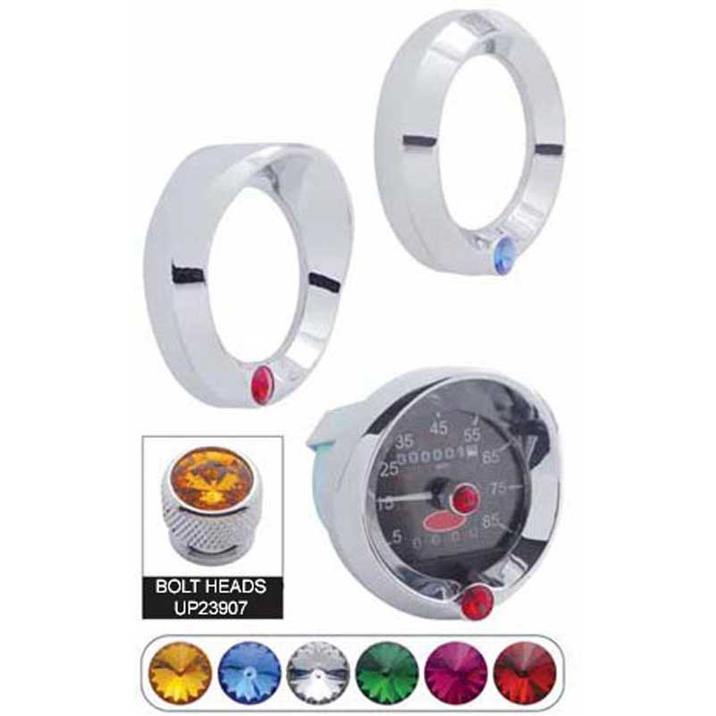 United Pacific - Signature Chrome Plastic Gauge Cover for Peterbilt - Speed/Tachometer Gauge Cover - Available with Visor - Available In Indented, - Sold Each - Fits Most 2006, 2007, 2008, 2009, 2010, 2011, 2012, 2013, 2014, 2015 Peterbilt 379/389/388/387/386 and Various Other Models