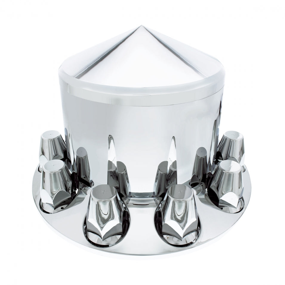 United Pacific - Pointed Rear Axle Cover Set-33 mm Thread-On - Chrome Rear ABS Axle Cover with Removable Cap, Pointed Cap - Includes 1 Cover, 1 Cap, and 10 Nut Covers Per Kit - Item # 10256, 10266 Also Includes 2 Metal Washers - Available in Pointed Style - Available with 33 mm Thread-On Push-On Nut Cover - Universal Fit, Fits Most 11 1/4" and Bolt Circle/Center Applications - Fits Most 20" 22 1/2", and 24 1/2" Wheel