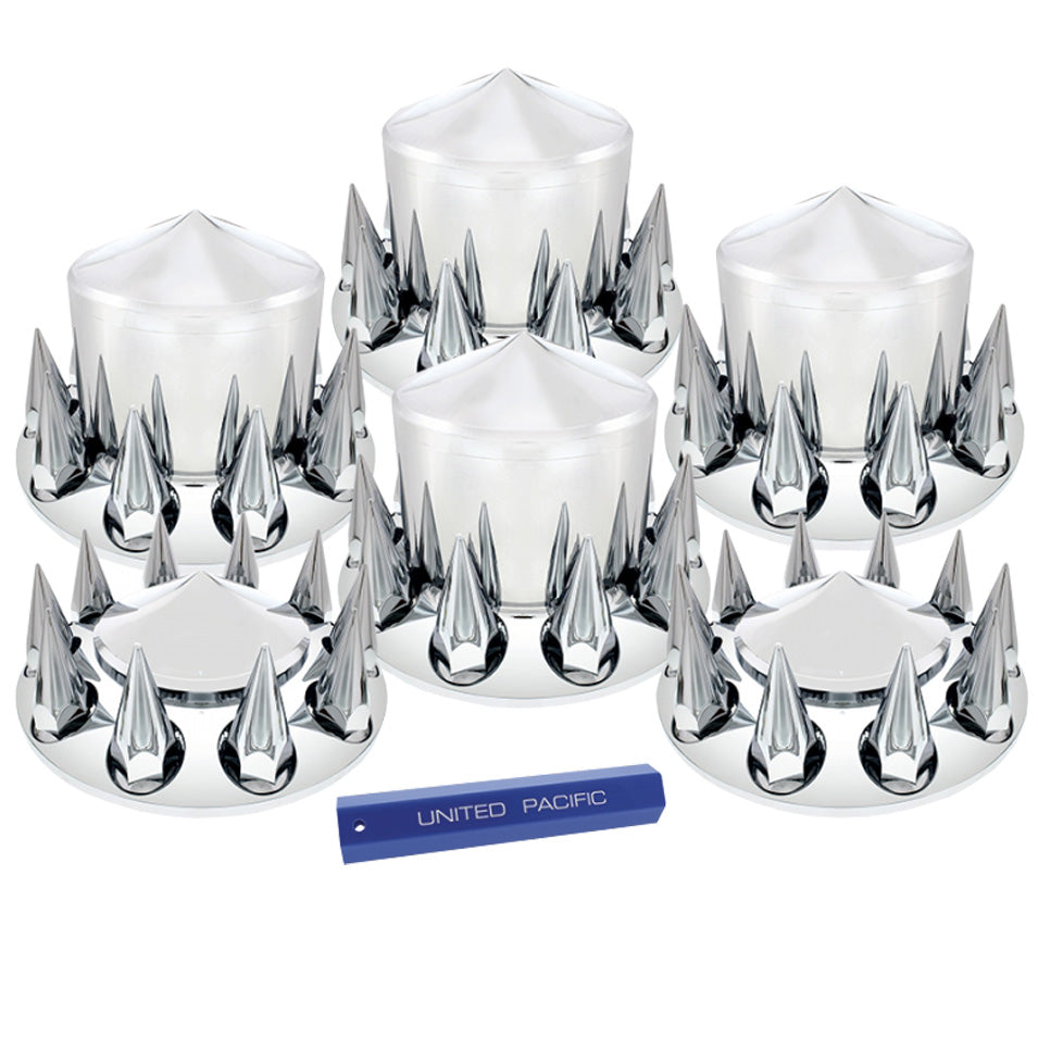 United Pacific - 33mm Thread-On Pointed Axle Cover Combo Kit with Spike Nut Cover - Chrome Plastic Axle Cover Combo Kit - Includes Everything You Need to Dress Up Your Wheels - Kit Includes: - (2) Chrome Plastic Pointed Front Axle Cover - (4) Chrome Plastic Pointed Rear Axle Cover - (60) Chrome Plastic 33mm Thread-On Pointed Nut Cover - (1) Nut Cover Tool - Fits Most Makes and Models