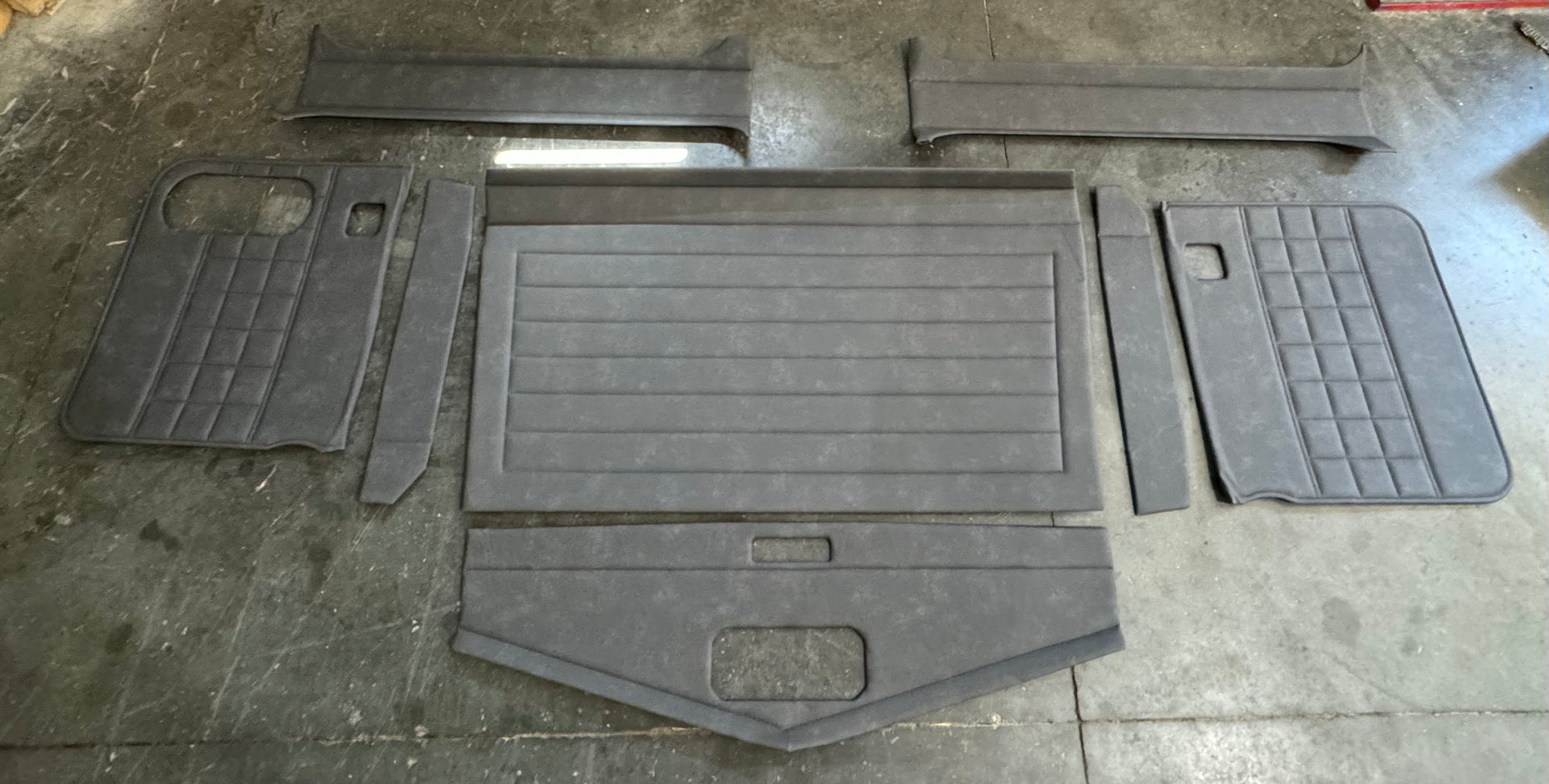 Peasterbilt Customs - Peterbilt 379 Ultra Cab Interior Kit Black Carrara with White Stitching - Kit Includes; Headliner, Radio Piece, 2 Door Panels, 2 Aluminum Side Pieces to Install Above Doors Behind Headliner & 2 Cab Corner Pieces. Aluminum pieces are so you have something stronger to screw the headliner to on the top sides to prevent sagging over time. It also provides something to mount speakers to so they don't come loose and fall out over time. Fits PB 379 Ultra Cab 1995 - 2005. Pick Up In Store Price ONLY. Call for freight pricing.